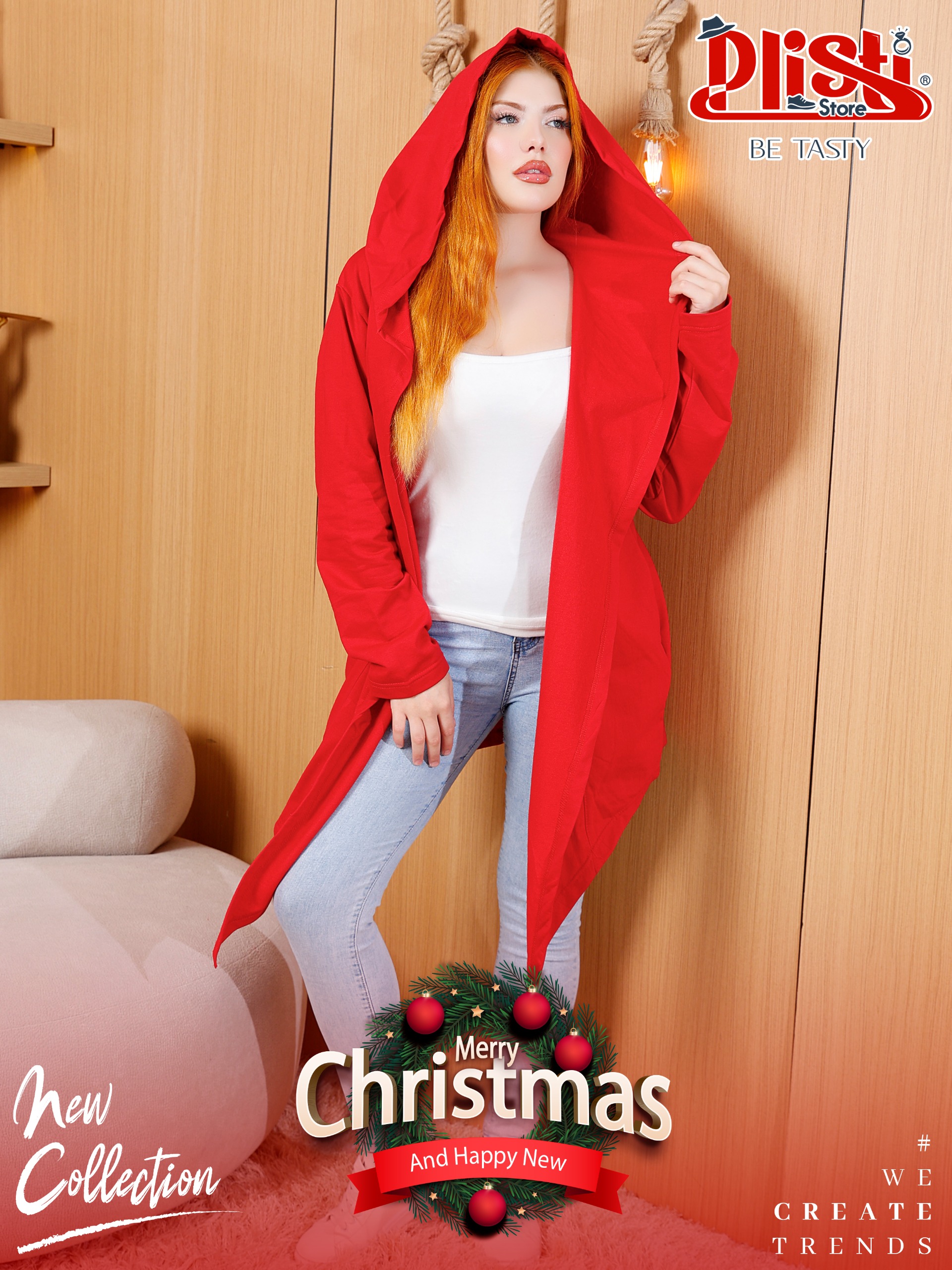 Red Cotton Cardigan – Unisex A soft cotton red cardigan with a hood, perfect for Christmas and fits both men and women.