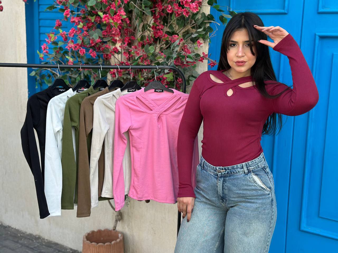 A stylish derby cotton blouse featuring a cross design at the neckline, combining comfort and a chic, modern look.
