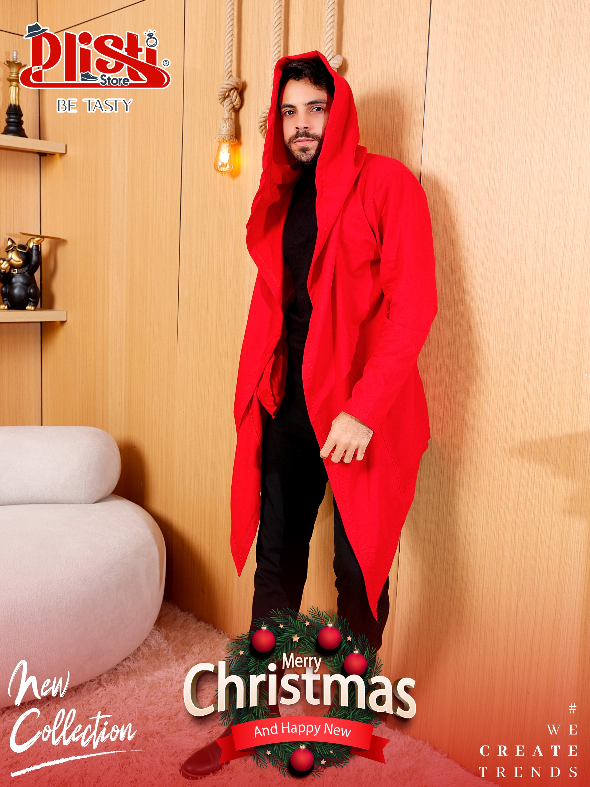 Red Cotton Cardigan – Unisex A soft cotton red cardigan with a hood, perfect for Christmas and fits both men and women.